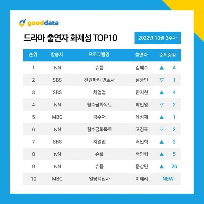 On October 25, Good Data Corporation published the most buzzworthy Korean dramas and actors in the third week of October 2022. As a result, tvN’s historical drama “Under the Queen’s Umbrella” and its female lead, Kim Hye Soo, top the most buzzworthy Korean drama and actor rankings in the third week of October 2022.