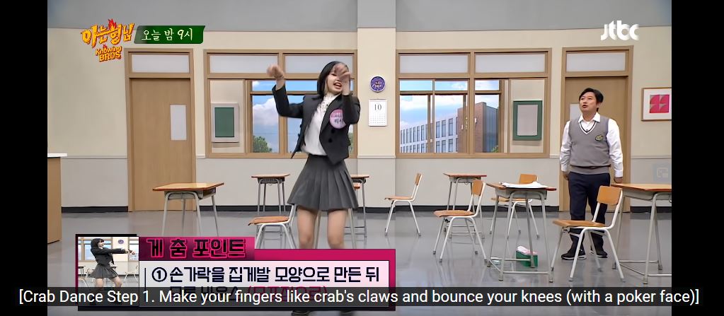 Second, knees bounce after clenching your hands while folding your arms. And what is the most important thing when dancing Crab dance is do it without expression.