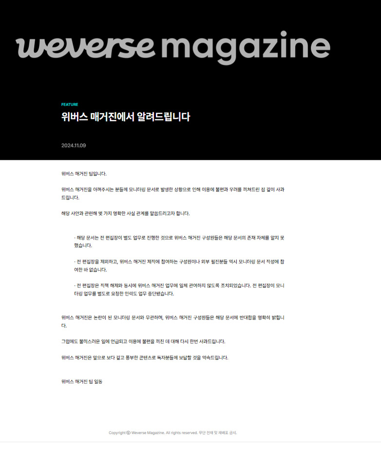 Weverse Magazine is not connected to the controversial monitoring document, and our team members clearly oppose the existence of such a document.”