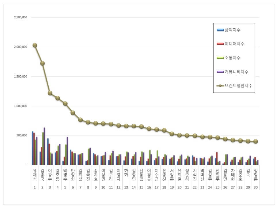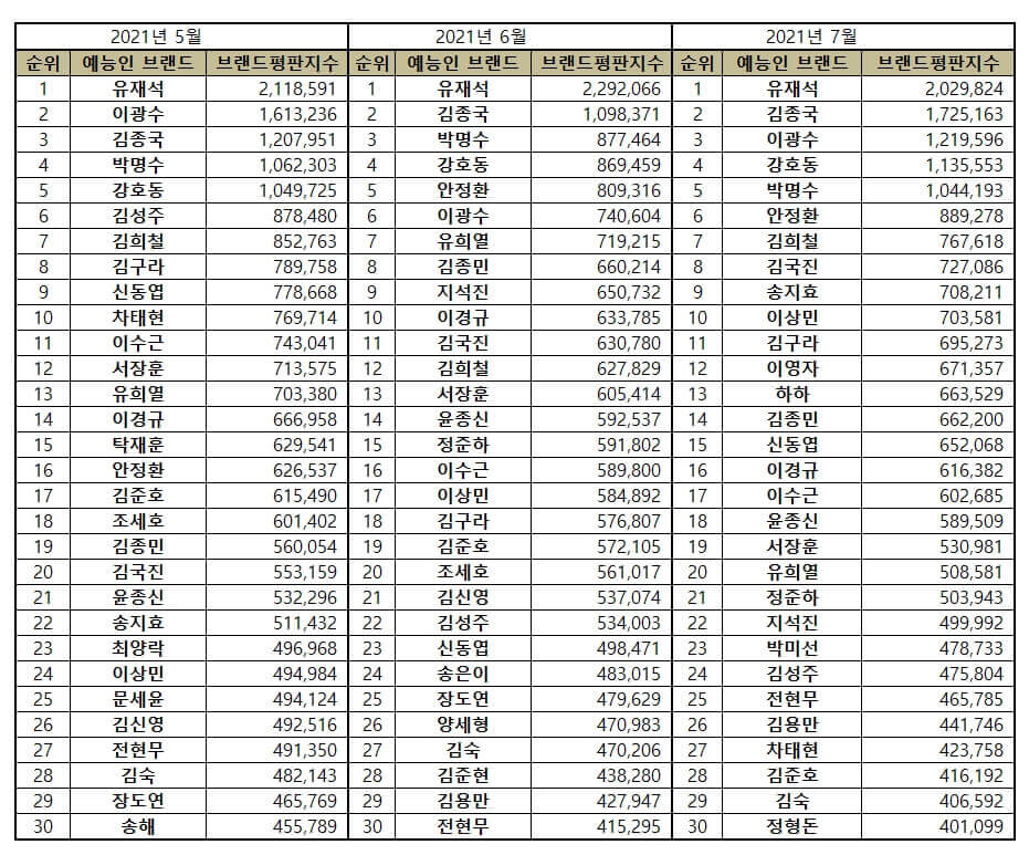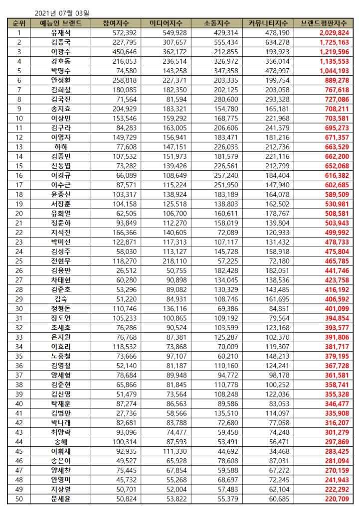 The Korea Corporate Reputation Research Institute has analyzed 28,158,202 big data of 50 brands of popular variety stars from June 3, 2021, to July 3, 2021. Moreover, the analysis consists of customer engagement, media coverage, interaction, and community awareness indexes of 50 popular entertainers. Compared to 26,117,271 big data for variety star brands in June, it increased by 7.81%.